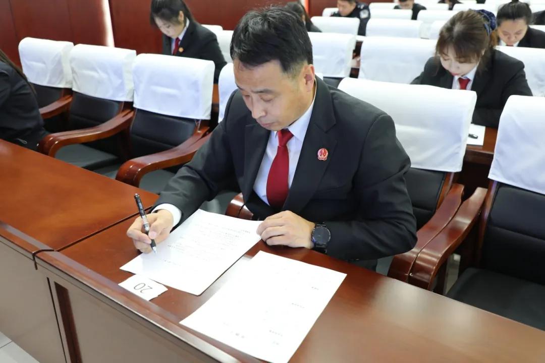 本次考核沿用笔试形式,考题紧扣法院当前工作实际,涵盖法律专业知识、党史知识、党纪知识、历史常识、时事政策、基本政治理论、保密知识以及法院现阶段重点工作等多个方面,考核工作严格按照既定程序严密组织实施。考核期间,考场秩序井然,全体参考干警态度严肃认真,全身心投入作答,整个考核流程规范有序、严谨细致。